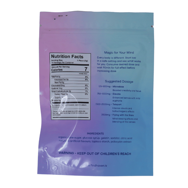 Elevate your experience with Haven Magic Mushroom Gummies, meticulously crafted for those who seek a deeper, more mindful journey. These gummies are the perfect fusion of potency and flavor, offering a smooth, balanced experience that allows you to connect with your surroundings and enhance your introspective exploration. Each gummy delivers a precise, controlled dose, ensuring a consistent and enjoyable experience. With their vibrant, fruity flavors, they provide a delicious way to embark on a transformative journey, allowing you to embrace the moment and explore new dimensions of awareness.